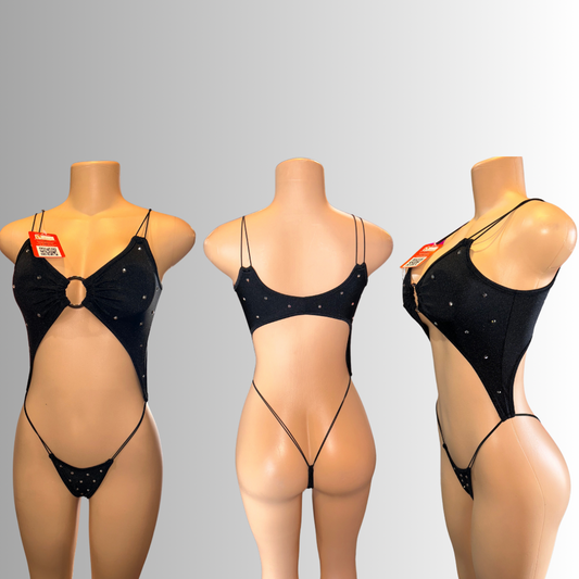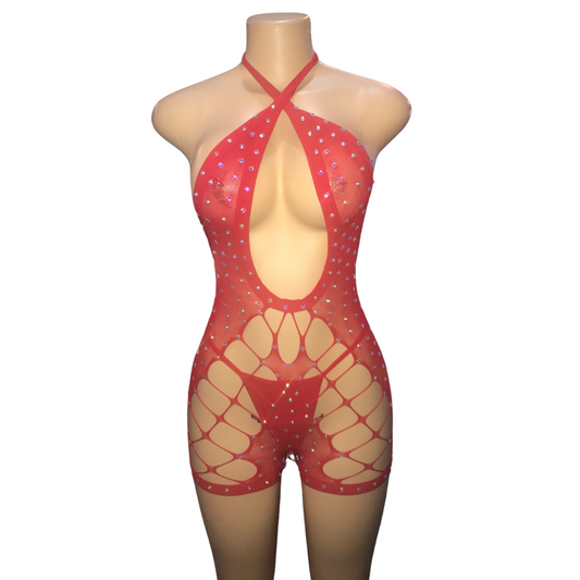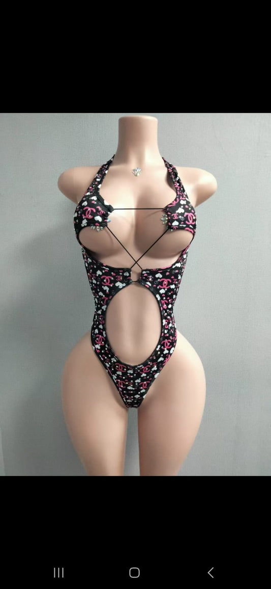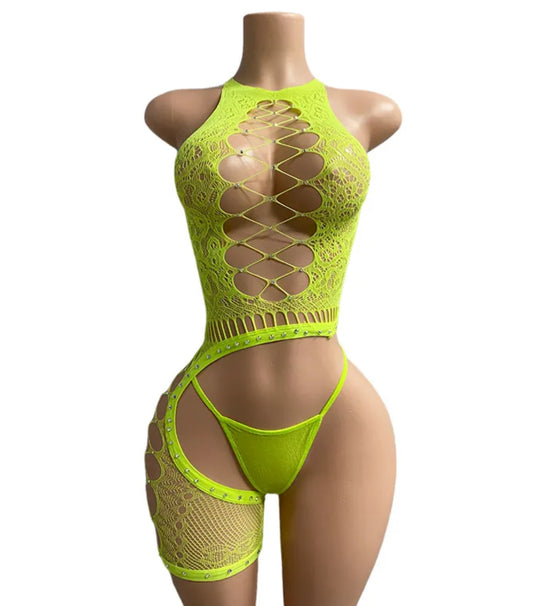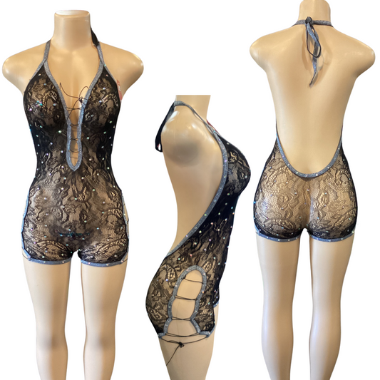 Dancewear exotic custom dancer outfits teddy one piece bikini halter top set thong romper lingerie rhinestones sequence fringes fishnet stocking