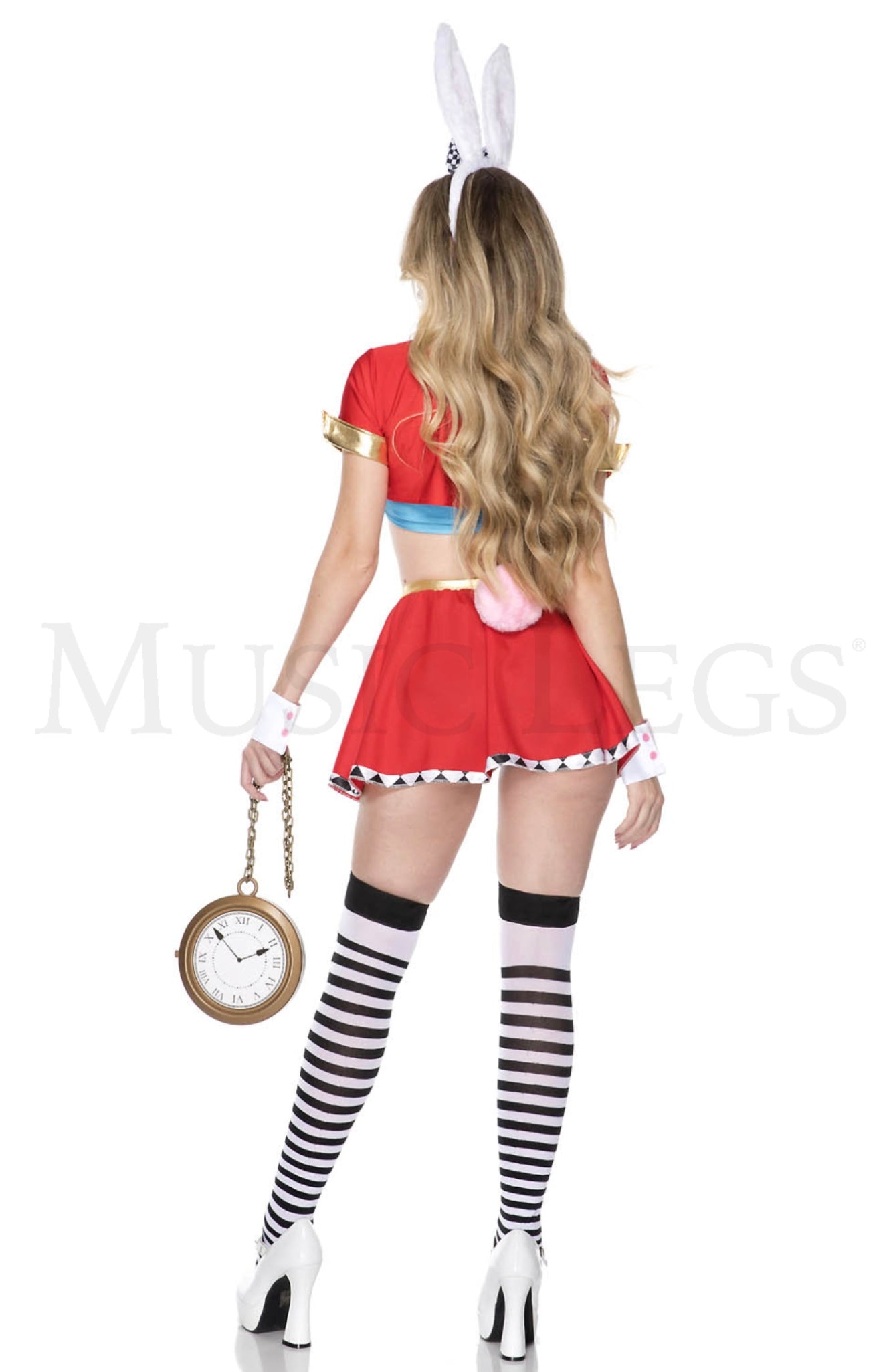 5 PC. includes: Short sleeve crop top with heart and diamond print details and metallic trim, matching skirt with attached garters, rabbit ears headband, cuffs, and tail