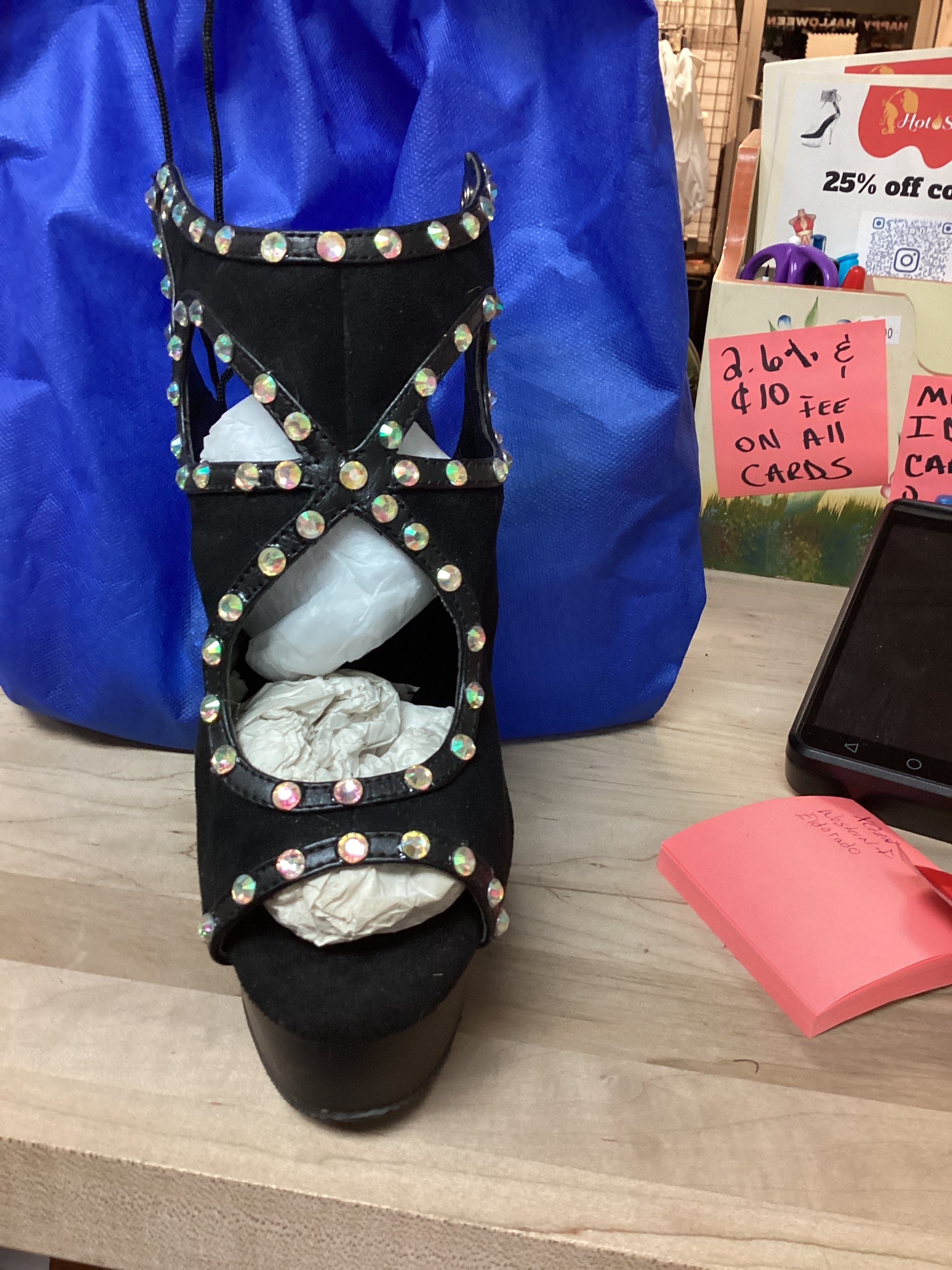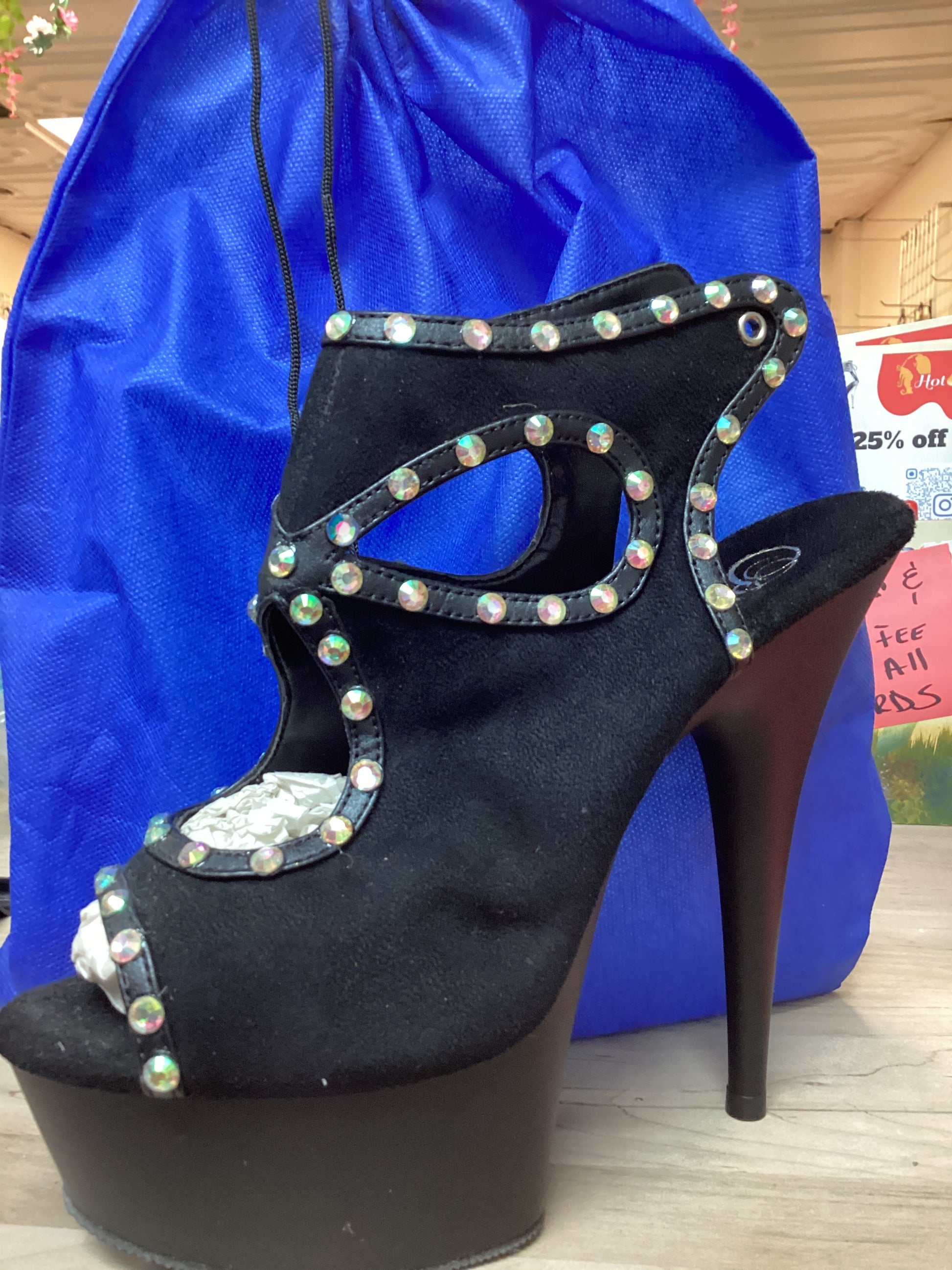 6" (152mm) Heel, 1 3/4" (45mm) Platform Cutout Bootie Sandal w/ Back Ties with rhinestones on leather outline