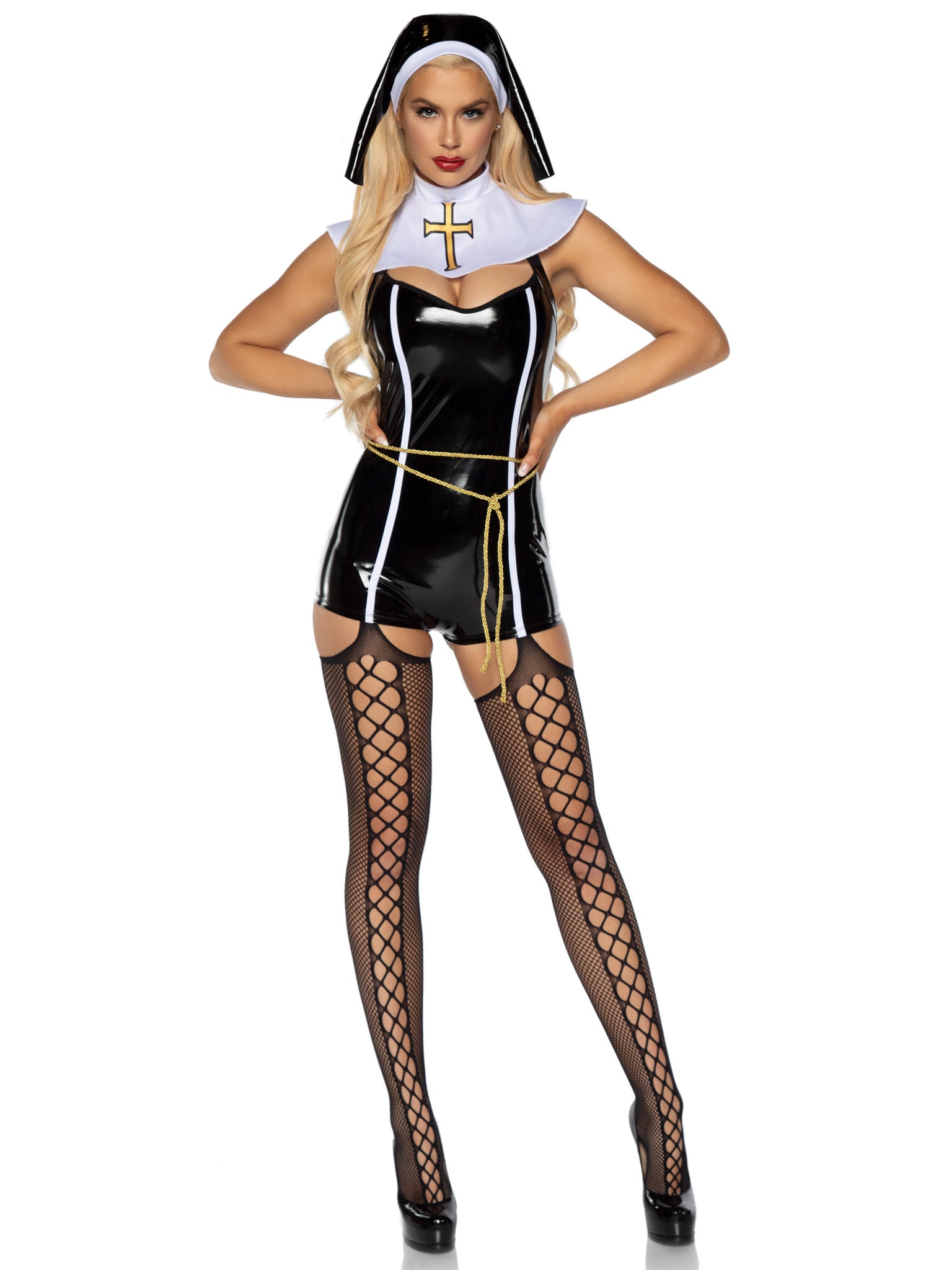 4 PC Sinful Sister, includes vinyl romper, rope belt, collar, and nun habit.